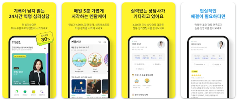 트로스트(Trost): 전문 심리 상담사와의 1:1 상담을 제공하며, 텍스트, 전화, 영상 통화를 통해